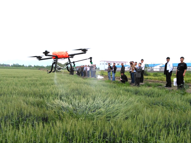 据介绍,这次演示的植保无人机每罐可盛装药剂10升,单次喷洒面积达15-20亩,当天下午,随着绿色麦浪的翻滚,不一会儿,70亩小麦的赤霉病、白粉病、蚜虫等穗期病虫防治任务就完成了,大大提高了喷洒效率,节约了人力和用水量,同时也提高了农药利用率。大家观摩了无人机演示后,纷纷咨询无人机的具体操作方法和应用范围。无人机喷施农药与传统灌溉不同的是,省时、省力、省水量,应用范围广。传统人工喷洒一亩田需要用水上百斤,但是无人机只需不到一公斤的水,而且对田间污染各方面都会有一定的改善。