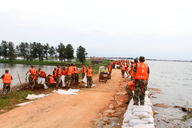 受长期高水位浸泡,枫沙湖跑马大堤安全受到威胁。险情就是命令。7月17日晚18:00时许,省武警总队接到命令后,立即派出80名武警战士和20名机关干部,赶往普济圩农场枫沙湖跑马大堤,对堤防进行加固处理。