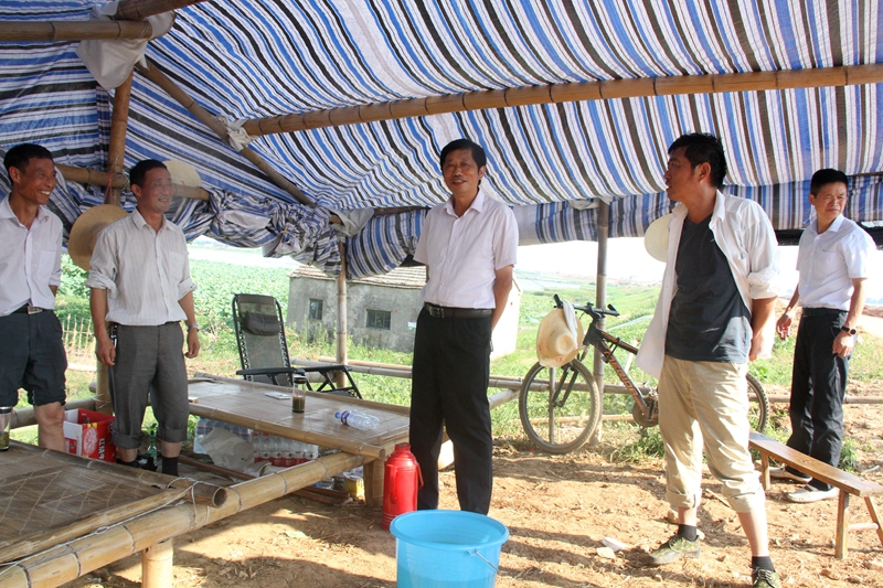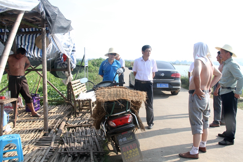 在跑马堤四分场责任段,殷文格感谢四顾墩王大爷对四分场防汛工作的大力支持,给您带来了不少麻烦。王大爷说,领导这么说就见怪了,我这间小屋让他们受苦了,总场、分场领导和你们的工人在今年的防汛中吃了很多苦,你们的辛苦也保住了我们的家园,我得要感谢你们才是。在看到四分场防汛棚时,殷文格要求,要做好防汛棚遮阳和防暑降温工作。