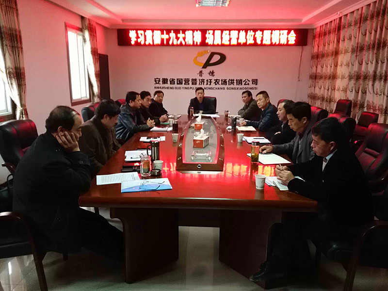 12月1日,场党委书记、场长殷文格前往供销公司,把握关切、创新方式,带头赴基层宣讲党的十九大精神。并与普济种业、供销公司、金迈公司、建筑公司、农发投公司领导班子座谈,对经营单位学习宣传贯彻十九大精神进行督促检查和专题调研,同时开展务虚会召开前的调研活动。总农艺师徐国东及人力资源部、综合办公室负责同志陪同参加。