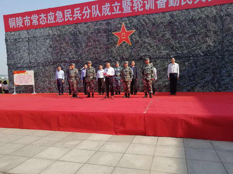 4月28日上午,集团公司10名基干民兵在人武部相关负责人的带领下,参加了全市国防常态应急民兵分队成立暨轮训备勤民兵拉动点验大会,我公司民兵被分配到专业力量中的郊区民兵保交护路分队。会上,市委副书记、市长、市国防动员委员会主任胡启生出席大会为新组建的4支常态应急民兵分队授旗,并作动员讲话。市委常委、铜陵军分区司令员李同柱,政委王永志等领导参加大会。