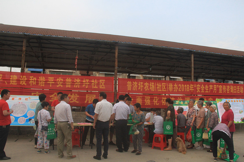 今年6月是全国第17个“安全生产月”,本次活动的主题是“生命至上、安全发展”, 此次宣传活动由集团公司安委办主办, 普济圩医院、普济圩社区、农科所及工会协同组织开展,各单位通过设立咨询台、宣传展板,发放安全宣传手册、宣传单等方式,对过往行人和社会公众进行安全生产知识宣传,并对前来咨询安全生产、农机安全、安全用农药、居民安全用电等问题的群众进行认真详细的答疑解惑。医院带来常用医疗检测仪器,给职工、群众免费提供健康医疗咨询。