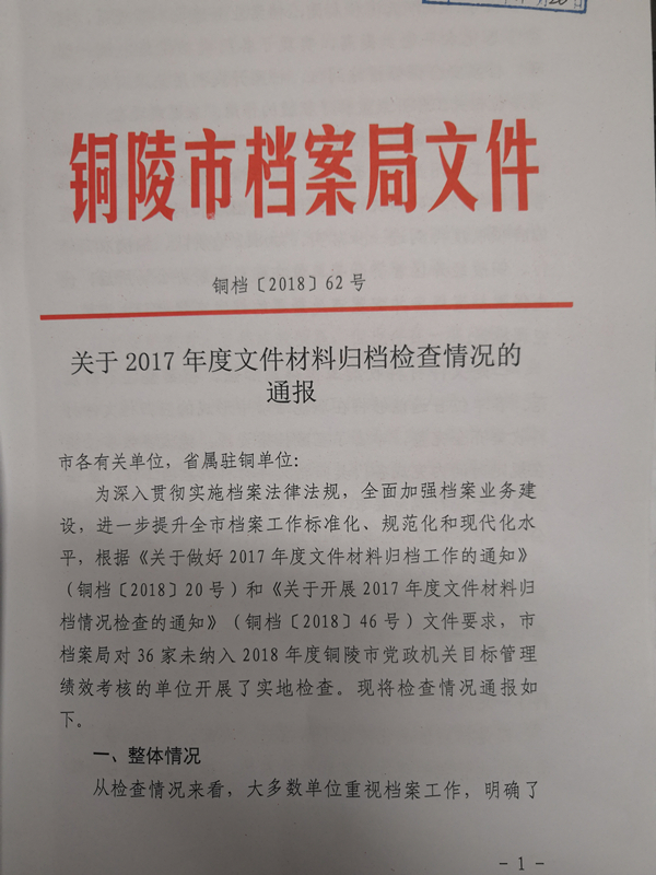 在市档案局正确指导和公司领导高度重视下,经过各部室的相互协作和共同努力,集团公司在市档案局实地检查中获得优秀等次,较往年取得明显进步。市档案局领导多次来公司实地察看、现场指导、认真分析、细致讲解,对我公司档案管理和档案移交进馆项目提出建设性意见。集团公司档案室将以服务人民为宗旨,继续努力,认真学习,提高综合素质和业务能力,进一步提升档案管理和服务水平,为企业的发展作出贡献。