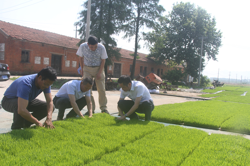 在第二分公司二队、四队场基水稻基质旱育秧基地,殷文格实地查看了集中育秧的秧苗,对苗情进行了认真诊断,并就做好秧苗后期温、湿度管理提出了建议。他指出,要严格控制播种量,防止加量播种,一般每盘播常规稻谷120克到130克,确保培育壮秧;要根据不同茬口布局设计不同播种时间,各分公司集中育秧基地对不同播种期的田块要统一记好台账,田间做好标记,以便更好地落实秧田管理措施;出苗后要随秧苗长高随时挑松无纺布确保秧苗直立生长,同时要适时洒水,防止高温烧苗。