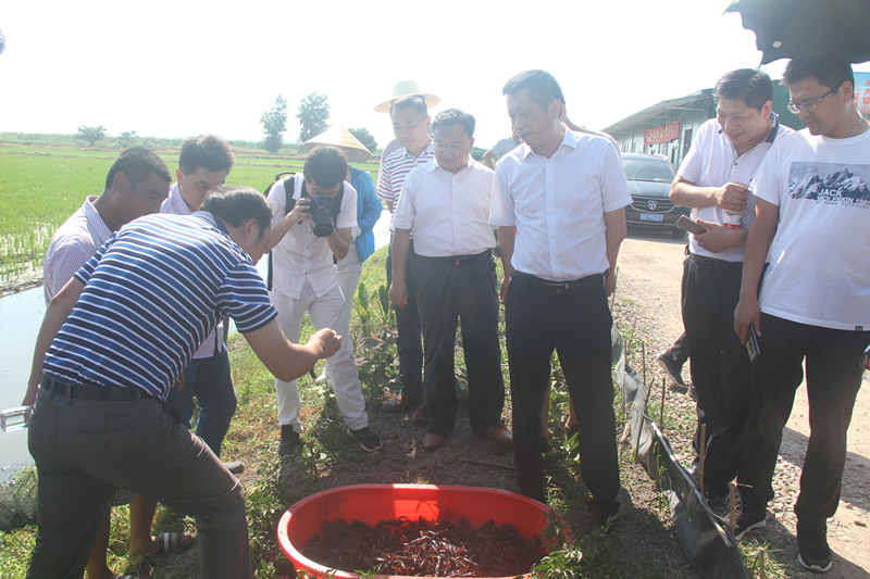 陈卫东一行参观了普农集团稻渔综合种养标准化示范基地,并对基地的稻虾综合种养技术、养殖设施和养殖模式的标准化、推广的速度、规模和效益等给予了充分肯定。